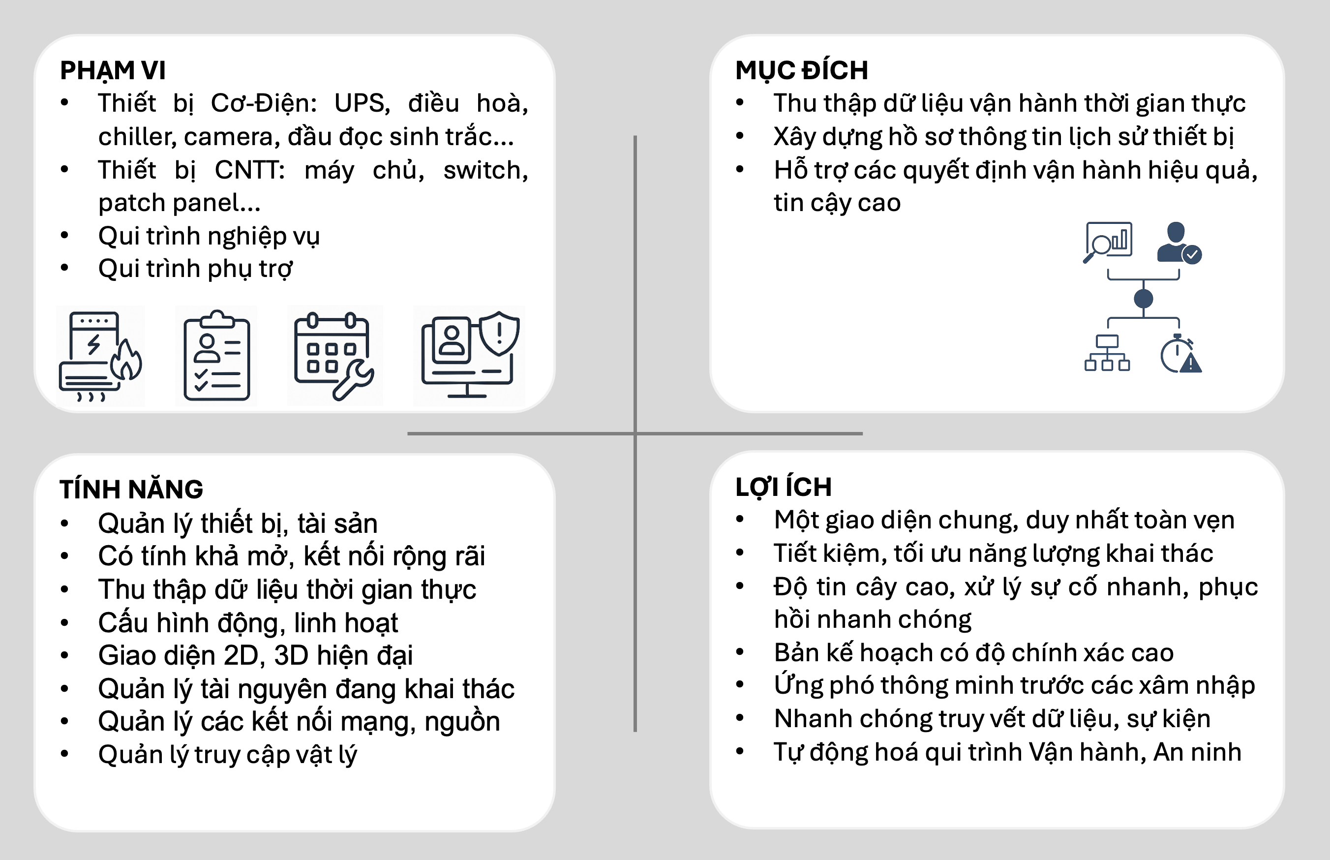Là sự kết hợp đồng thời hệ thống BMS (quản lý hạ tầng Cơ-Điện) với hệ thống DCIM (quản lý tài nguyên CNTT) để mang lại các lợi ích vượt trội về: giao diện chung toàn diện, tối ưu năng lượng tiêu thụ, tin cậy trong việc lập kế hoạch phát triển cũng như khả năng ứng phó trước các sự cố gián đoạn dịch vụ CNTT.